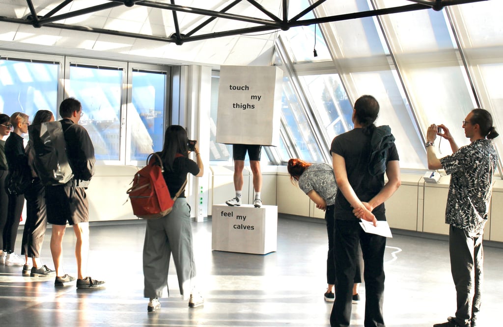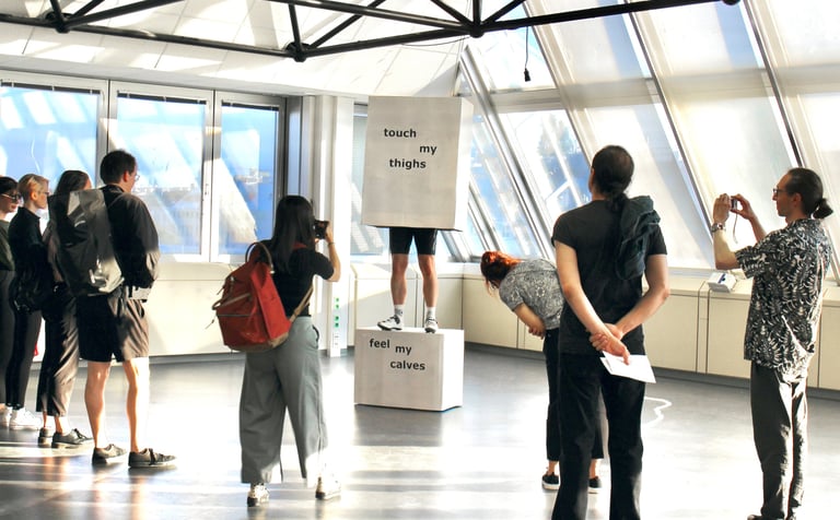 Photo: Live performance by (I) Instructor, Touch my thighs, feel my calves, Public | Private exhibition vernissage on June 16th, 2024.