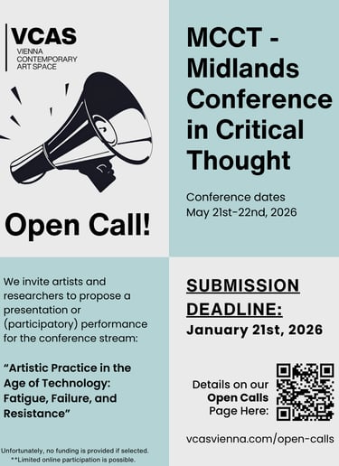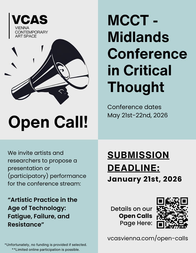 Applications are to be submitted directly to the larger MCCT organisation, which will then forward the submission for our stream "Artistic Practice in the Age of Technology: Fatigue, Failure, and Resistance," to our team at VCAS.