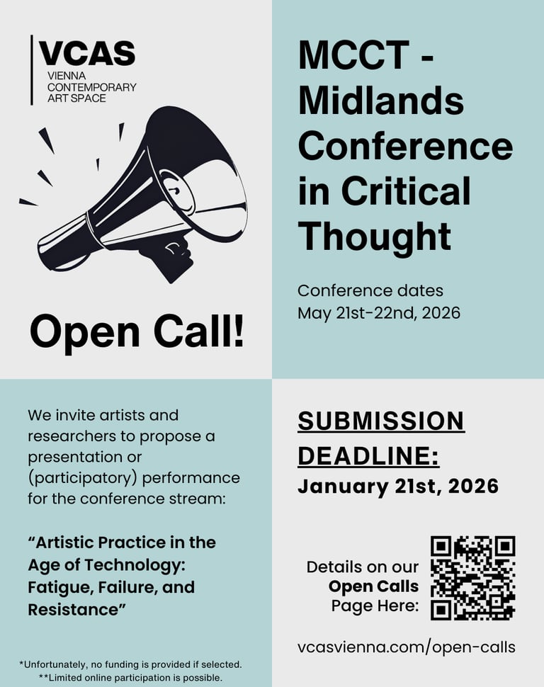 Applications are to be submitted directly to the larger MCCT organisation, which will then forward the submission for our stream "Artistic Practice in the Age of Technology: Fatigue, Failure, and Resistance," to our team at VCAS.